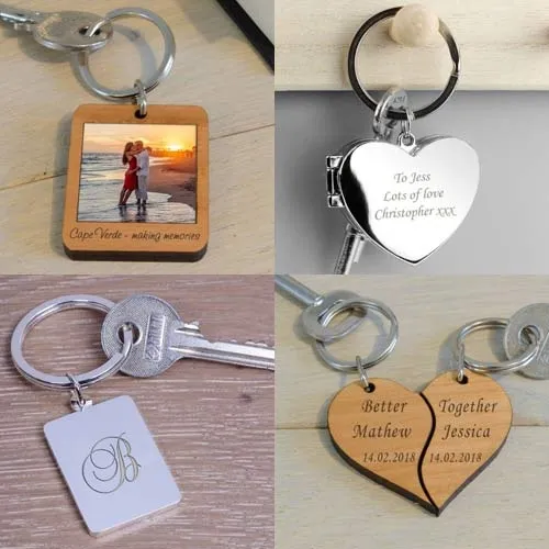 A selection of well made personalised keyrings made from engraved wood and metal. Lovely inexpensive gift idea
